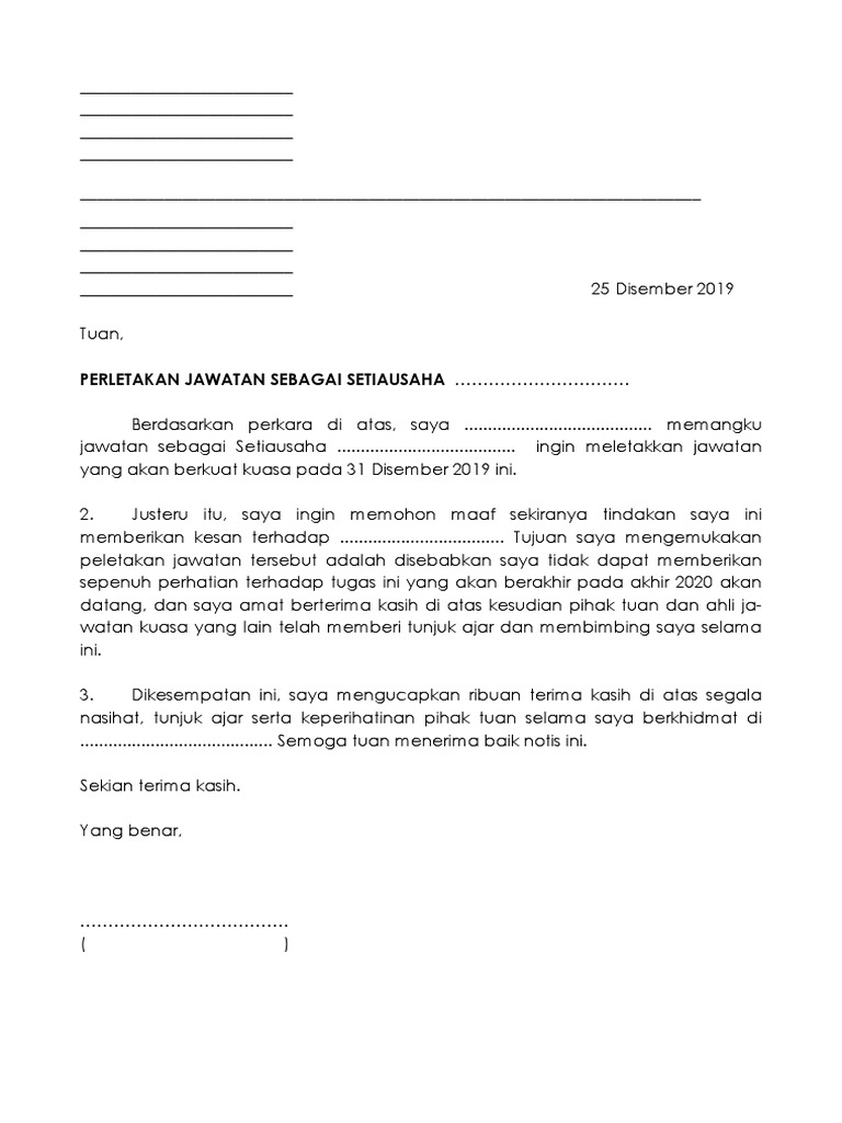 Contoh Surat Perletakan Jawatan Sebagai Bendahari Persatuan from i2.wp.com Contoh surat perletakan jawatan pengerusi jkkk <nama pengerusi> <alamat rumah> tarikh : Dengan segala hormatnya perkara di atas adalah dirujuk. <tarikh> <nama ketua kampung> <alamat pejabat jkkk> tuan, perletakan jawatan pengerusi.